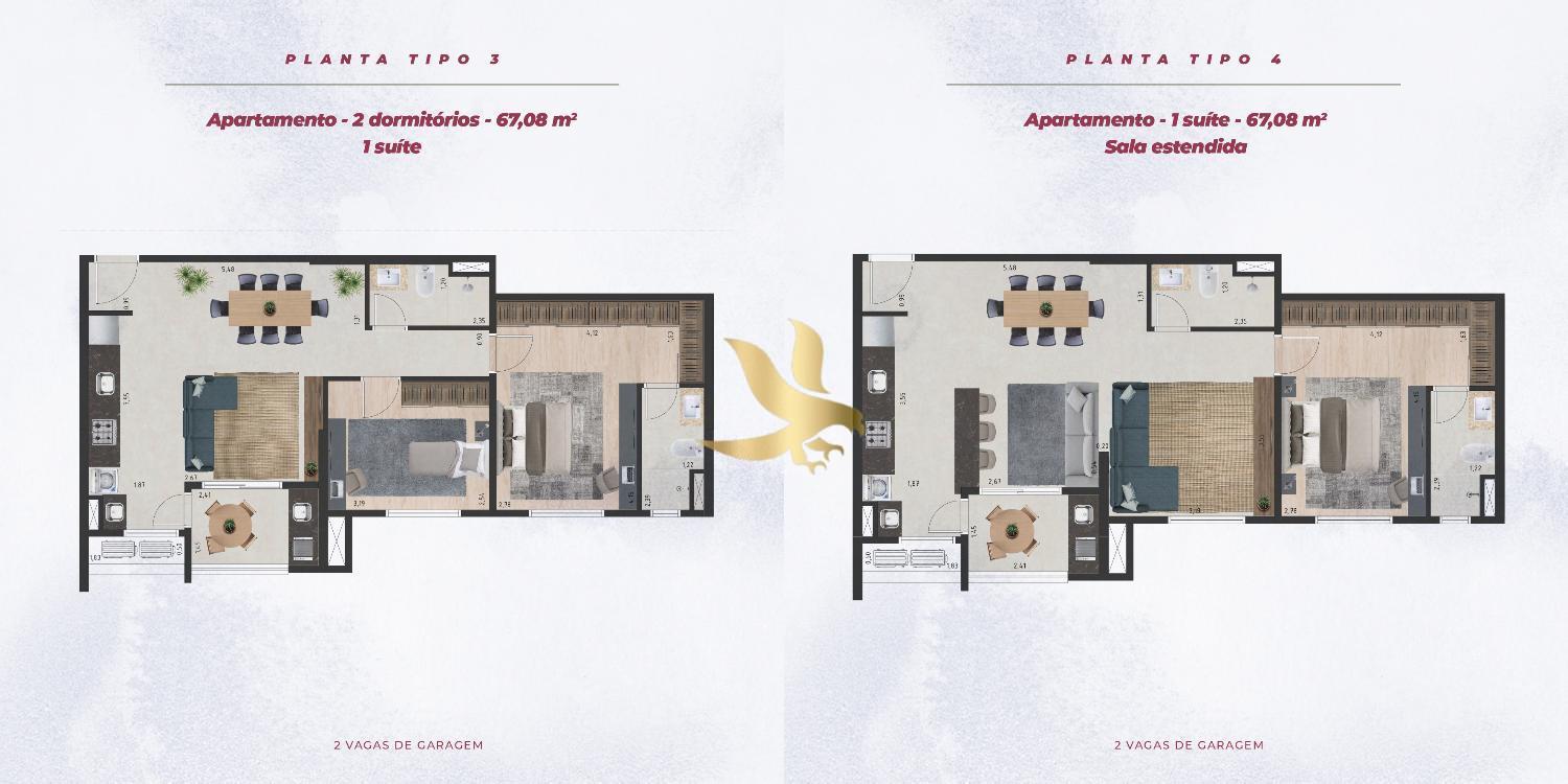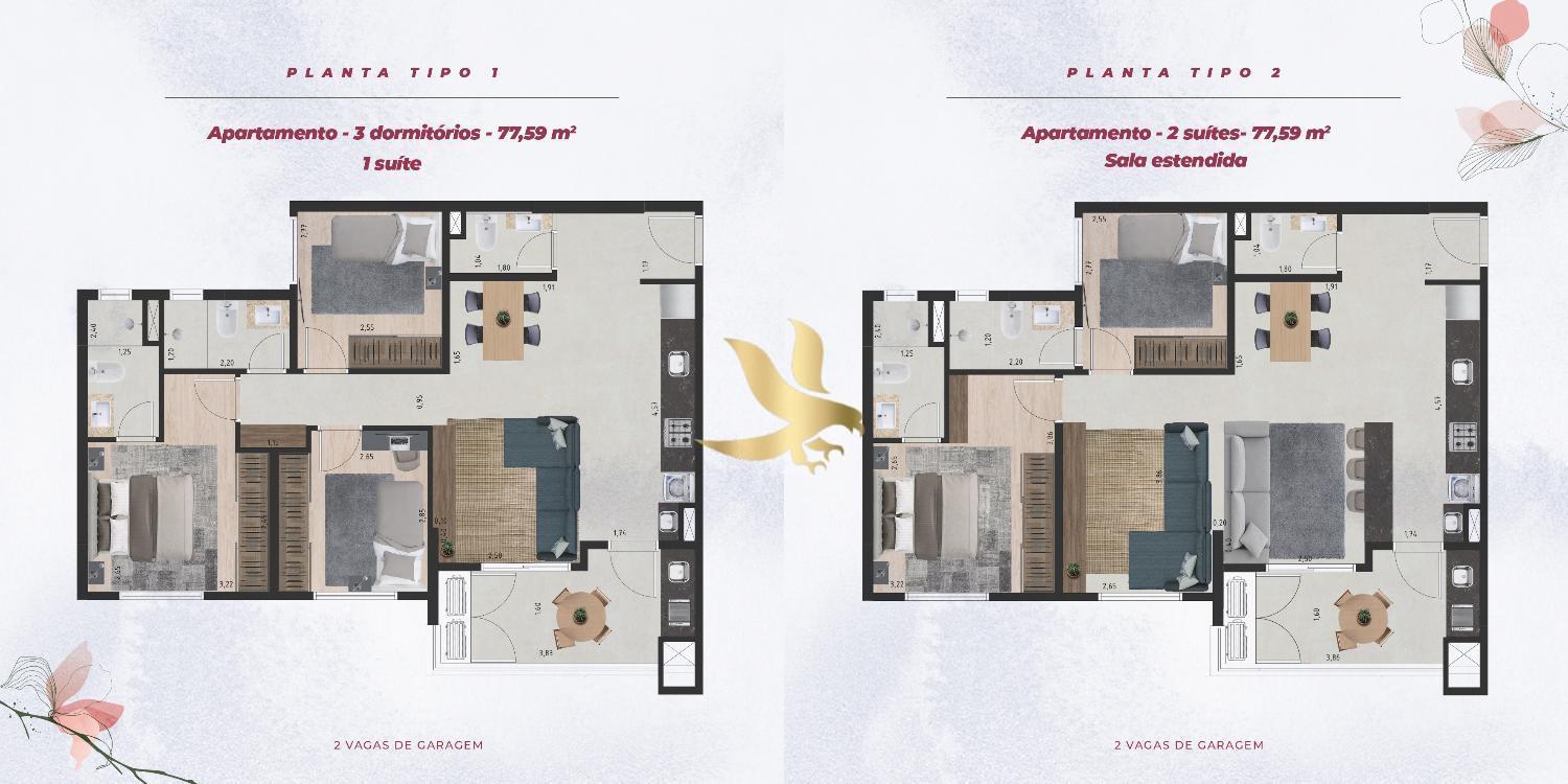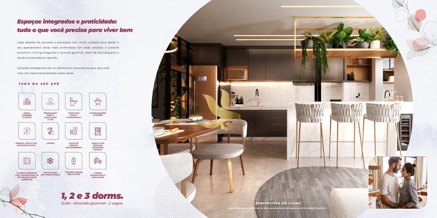 Os apartamentos, com plantas inteligentes de 2 ou 3 dormitórios (até 77,59 m²), foram projetados para elevar o conceito de bem-estar. O destaque fica para o living integrado à varanda gourmet com churrasqueira a carvão, criando um ambiente amplo e fluido, perfeito para momentos de hospitalidade. Cada detalhe reflete modernidade, desde as tomadas USB na suíte até a infraestrutura para ar-condicionado e persianas integradas, unindo funcionalidade e alto padrão de acabamento.