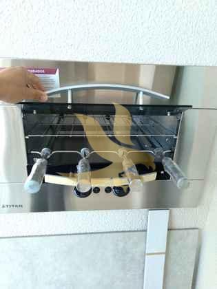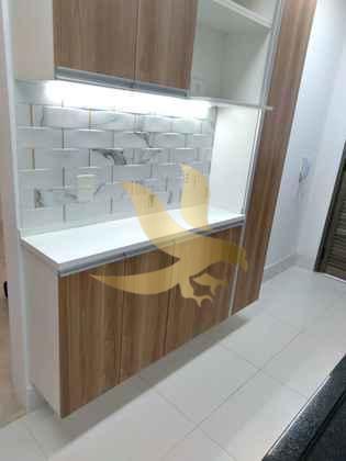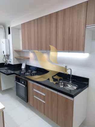 oktop Suggar, forno a gás Brastemp, depurador de ar marca Tramontina e aquecedor a gás Rheem. Bancadas em granito e armários planejados oferecem funcionalidade e organização.