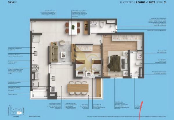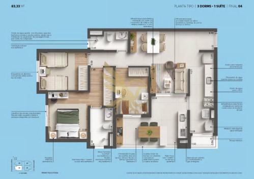 O projeto reflete uma estética contemporânea e cosmopolita em uma torre única com apenas 80 unidades. Os apartamentos, com metragens de 74 m² e 83 m², apresentam plantas inteligentes com 2 ou 3 dormitórios (suíte), varanda gourmet integrada nivelada à sala e acabamentos nobres, como porcelanato nas áreas úmidas e persianas integradas com blackout nos dormitórios para um conforto acústico e visual absoluto.