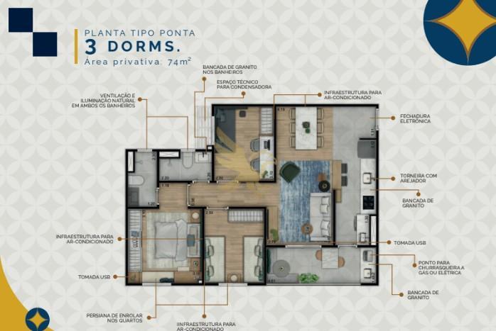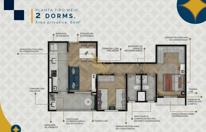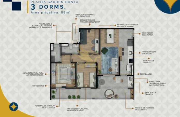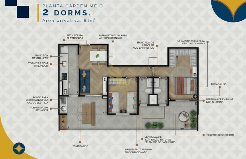 As unidades, distribuídas em duas torres imponentes, oferecem plantas inteligentes de 2 e 3 dormitórios (com suíte), variando de 60m² a 88m² nas exclusivas opções Garden. Cada detalhe reflete um padrão superior de acabamento: da fechadura eletrônica à varanda gourmet com ponto para churrasqueira, passando por infraestrutura completa para ar-condicionado em todos os dormitórios e sala, além de persianas de enrolar que garantem o máximo conforto térmico e acústico.