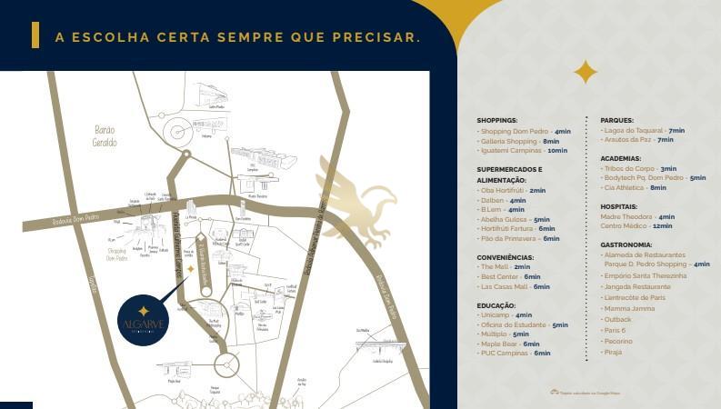 Apresentamos o Algarve Residencial, uma ode à sofisticação e ao bem-estar, estrategicamente posicionado no Le Monde, o bairro planejado mais exclusivo de Campinas. Com acesso imediato às principais rodovias e cercado por uma infraestrutura de elite, a poucos minutos do Shopping Dom Pedro, Galleria e Iguatemi, este empreendimento redefine o conceito de conveniência urbana em uma localização verdadeiramente privilegiada e segura.