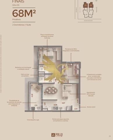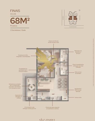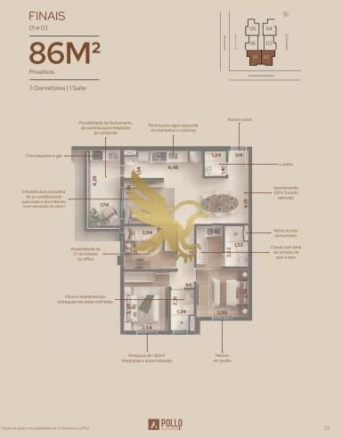 A arquitetura contemporânea da torre única revela apartamentos de 68 m² e 86 m², com 2 ou 3 dormitórios (1 suíte) e 2 vagas de garagem. Cada unidade é um convite ao bem-estar, entregue com infraestrutura completa para ar-condicionado, churrasqueira a gás na varanda gourmet, persianas automatizadas e pé-direito de 3,06m. O requinte se estende aos detalhes técnicos, como o acabamento 100% forrado tabicado, ralo linear e nichos nos banheiros, garantindo uma estética impecável e funcional.